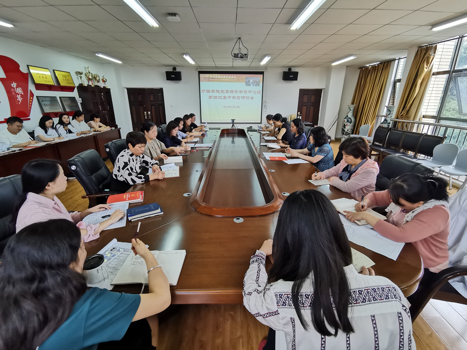 6月26日,tyc122ccVIP在南校区百川楼五楼会议室开展党委理论学习中心组第四次集中学习研讨,公司党委委员、副科级以上干部、党支部书记和全体辅导员参加,会议由公司党委书记杨英主持。