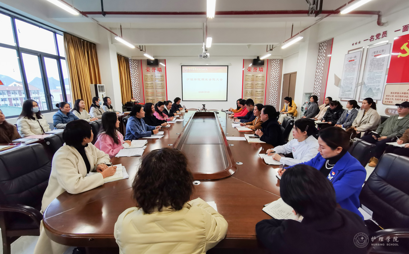 1月15日,tyc122ccVIP在云漫湖校区酬勤楼六楼会议室召开期末全院大会总结部署工作,会议由公司党委书记杨英主持,全体教职工参会。