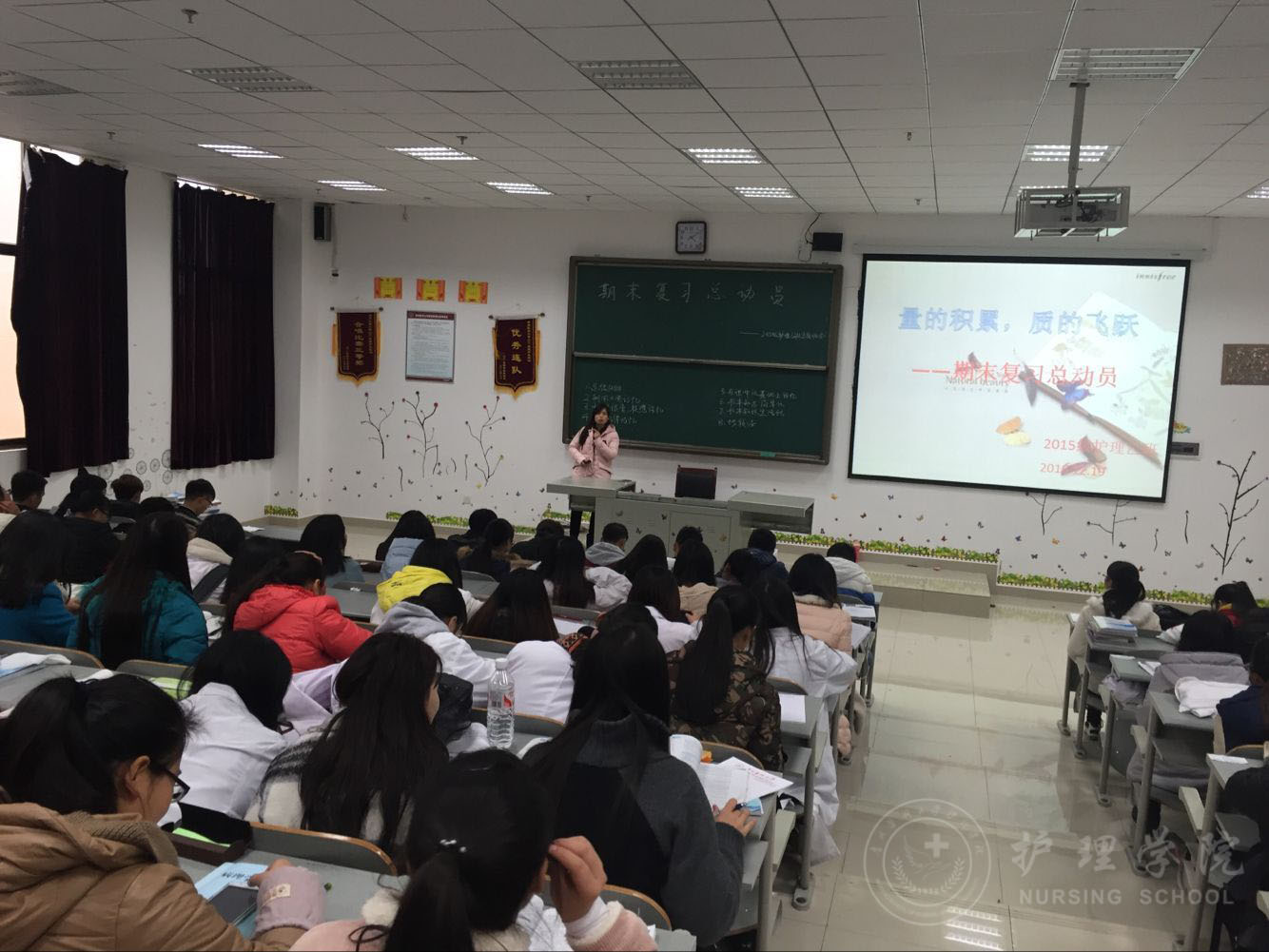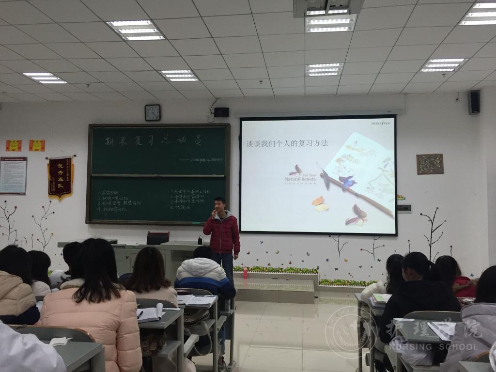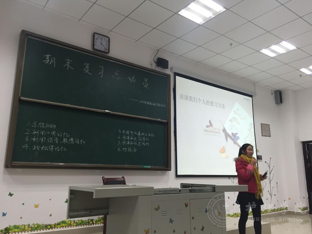 12月19日下午4:30,2015级护理乙班在南校区4407教室开展了以“量的积累,质的飞跃——期末复习总动员”为主题的班会。此次班会由班主任老师李红主持,2015级护理乙班全体同学参加,分两个环节进行。