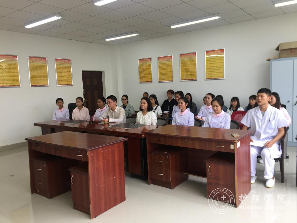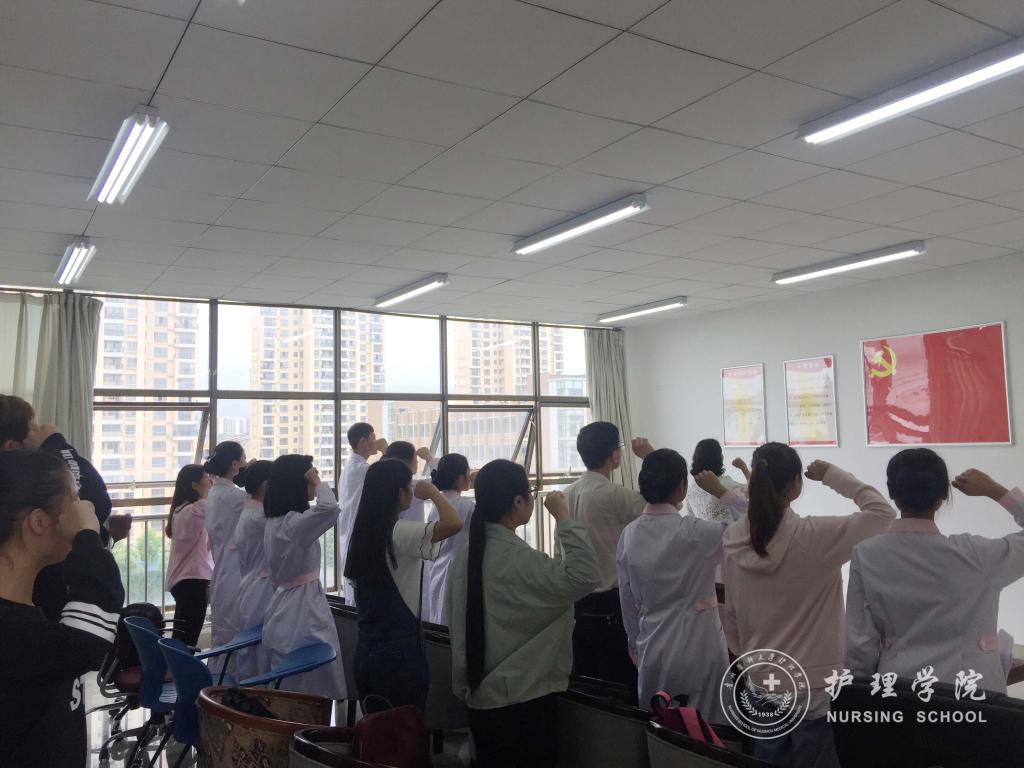 活动在庄严的《国际歌》中拉开了序幕,在辅导员马景瑶宣读2017年上半年新党员名单后,全体党员立正,面向党旗举起右手,在杨英副书记的带领下,面向党旗庄严宣誓:“我志愿加入中国共产党……随时准备为党和人民牺牲一切,永不叛党。”每个新党员都激动而又坚定地立下了自己一生无悔的誓言。接下来,2015级护理学甲班的夏啰啰同学代表新党员进行发言。他表示要以一名优秀党员的标准来严格要求自己,树立远大理想,牢记南丁格尔精神,学好专业知识,提升综合素质,努力为人民服务。