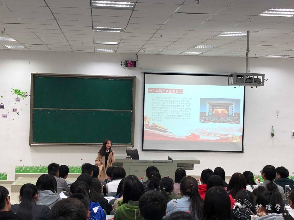 此次宣讲共分为三个部分。首先,由主持人尹本渊同学介绍了本次宣讲的特邀嘉宾并做了简单介绍。接着,由李昱林同学带领大家从两个方面进行了关于十九大报告的学习:一是从“八个新”来详细解读十九大,其中着重介绍了“新青年”,其主要目的在于激励大家“作为新时代的新青年,我们要牢固树立新思想、刻苦锤炼新本领、奋发展现新作为”,二是介绍了改革开放以来在“医疗卫生事业上的改革”,与今天的卫生工作方针进行对比突出了新时期国家对医疗卫生事业的重视程度,对医护人员的关注度普遍提高。最后,由主持人尹本渊进行了总结发言,要求同学们不仅要学好课堂知识,同时也要做新时代的新青年,做一名不忘初心的追光者,做一名砥砺前行的新青年,秉承为人民服务,为祖国的医疗卫生事业而奉献的精神,贡献自己的力量。