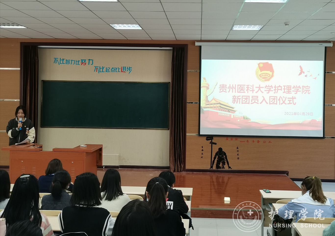 会议在庄严的国歌下拉开帷幕。会议第一项,主持人张凤毅庄严阐述入团仪式的意义,宣布新团员名单。第二项,由刘妍同志向新团员颁发团徽,新团员意气风发,实现了与团徽的第一次并肩,这是共青团肩负重任的标志。第三项,刘妍同志带领新团员在团旗下面对鲜艳的团期庄严宣誓,这是对新老团员们心灵的一次洗礼,也激发了团员青年们的荣誉感和使命感;第四项,主持人宣读《团章》中有关团员的义务和权利的条款,使新团员们初步了解自己的新使命,更加坚定了为共产主义奋斗的理想信念;第五项,新团员代表颜瑶同学发言,她讲述自己入团的艰辛历程,终拨云见日成功入团的经历,也表明了自己在今后生活学习中要时刻以优秀共青团员身份严格要求自己;第六项,老团员代表石宇卉同学发言。“新团员的加入,为共青团注入了新鲜血液,但入团只是人生新的起点,在生活中个学习中,更要严格要求自己,遵守纪律,树立良好品德。”第七项,刘妍老师总结讲话。她对新团员提出了殷切希望和要求,希望全体团员进一步提高自身综合能力,加强团的理论知识的学习,勤奋努力,做好党的后备军。最后,全体参会人员同唱《光荣啊,中国共青团》,会议圆满落下帷幕。