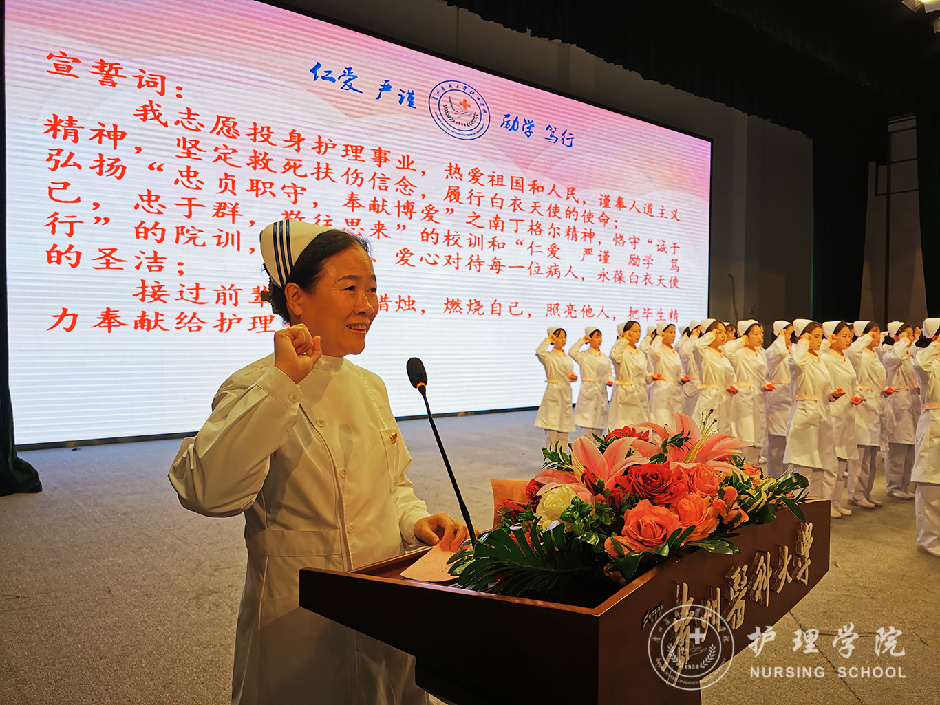 随后,伴随着悠扬的音乐旋律,同学们按照顺序,手捧燕帽,迈着整齐的步伐走上舞台,28名护理前辈亲手为他们戴上了圣洁的燕帽。在南丁格尔铜像的注视下,经理李亚玲带领全体新生庄严宣誓,同学们纷纷举起右手,手捧红烛,许下了护理学子的铮铮誓言和践行救死扶伤神圣使命的承诺和决心,并在院团委副书记王晓玲的指挥下齐唱护士之歌。