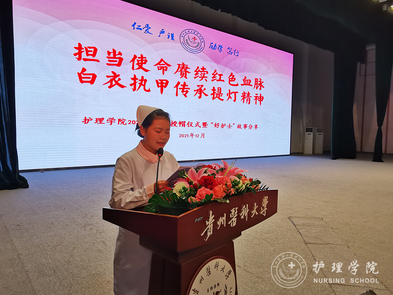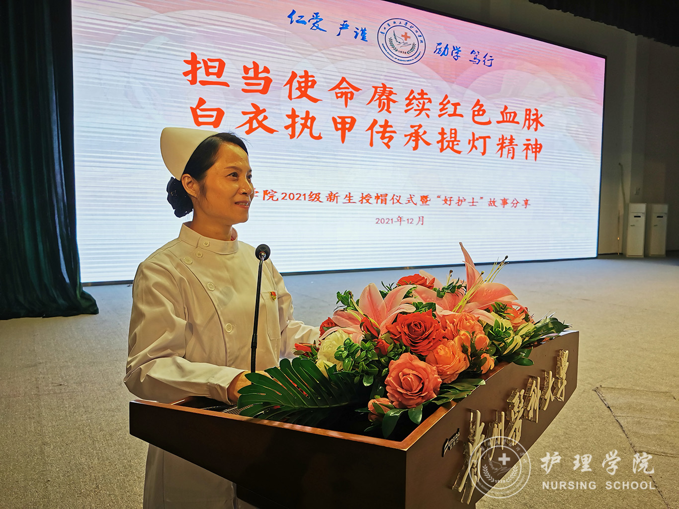 12月8日,为纪念“一二·九”运动86周年,传承和弘扬护理事业的光荣传统,激励新生增强使命感、责任感和归属感,在新时代新征程中勤奋学习,奋勇争先,tyc122ccVIP在南校区大礼堂举行了以“担当使命赓续红色血脉、白衣执甲传承提灯精神”为主题的2021级新生授帽仪式暨“好护士”故事分享活动,由28位优秀护理前辈为724名护理新生授帽传烛。活动由公司党委副书记兼纪委书记何为主持。