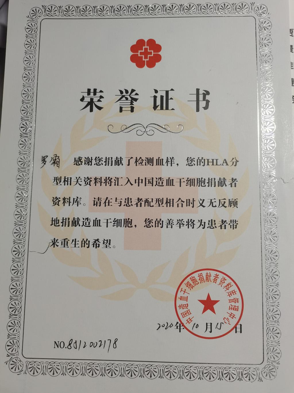 2020年10月15日捐献造血干细胞,加入中国造血干细胞捐献者资料库