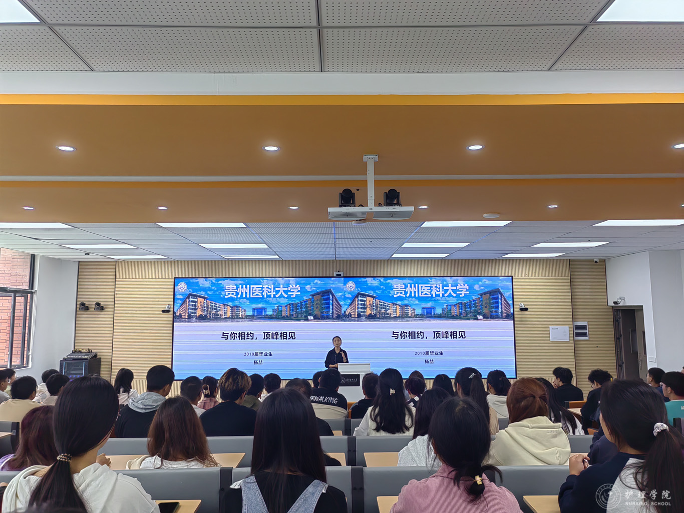 杨喆以《与你相约 顶峰相见》为题分享了自己十八年来的学习与科研经历,她表示,持续学习、主动吃苦、耐心专研是护理人的生命力,呼吁同学们把握青春机遇,收获无悔时光。