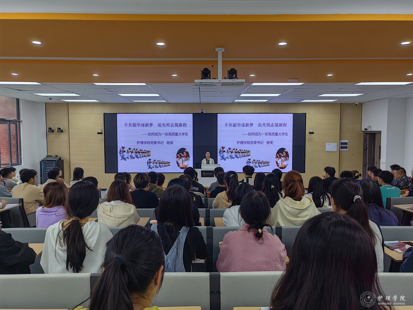 杨英以《不负韶华逐新梦 追光明志筑新程》为题,从现代护理学的诞生、护理学的发展、人生规划与专业发展四个方面结合历届南丁格尔奖章获得者的事迹,引导全体同学追随前辈脚步,感悟精神实质,传承发扬南丁格尔精神,扬起实干风范,燃起拼搏之质,勇担新时代使命,确立为患者服务的远大理想和争当“白衣天使”的奋斗目标,珍惜大学时光,将个人的奋斗追求融入党和国家事业建设之中,努力使自己成为有理想、敢担当、能吃苦、肯奋斗的新时代好青年,为建设富强民主文明和谐美丽的社会主义现代化强国做出自己的贡献。