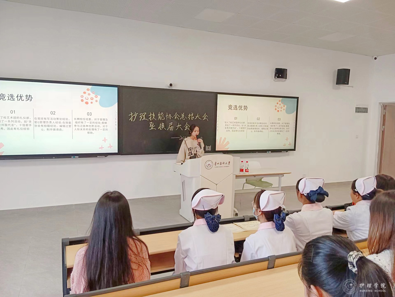 首先,副会长叶慧同学就技能协会的工作进行了总结,对各部门取得的工作成效给出了肯定,鼓励大家要以身作则,努力提高工作的积极性,加强各部门的配合。随后,各部门副部长依次上台进行部门工作总结,对工作内容进行回顾和反思,并认真筹备接下来的工作,梳理思路和举措。最后,各部门成员依次上台发言参与竞选。