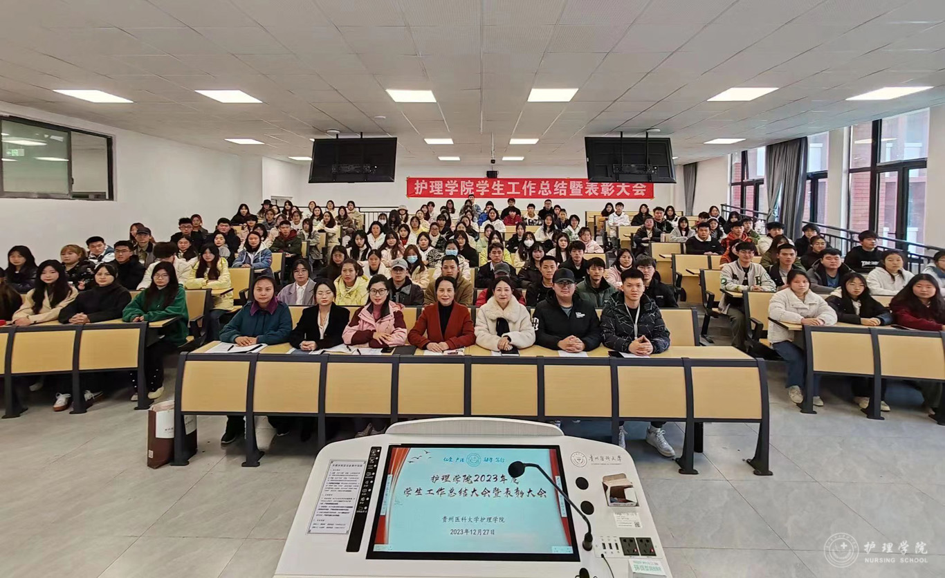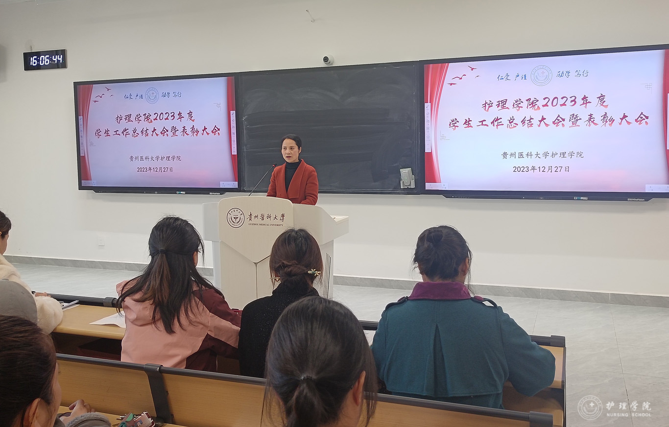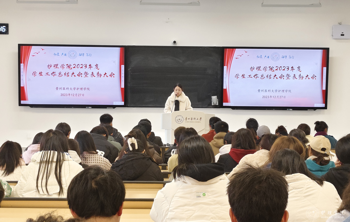 张黎从党团建设、员工日常管理、专项工作、社会实践、校园文化活动以及员工工作获奖等方面对公司2023年员工工作进行了全面的总结。员工管理科副科长毕丽宣读了先进集体和优秀个人受表彰名单。2022级护理学朱月成同学作为员工代表发言,他分享了自己参加员工管理工作、各类科研比赛以及社会实践活动的经历,号召同学们要增强作为护生的责任感和使命感。