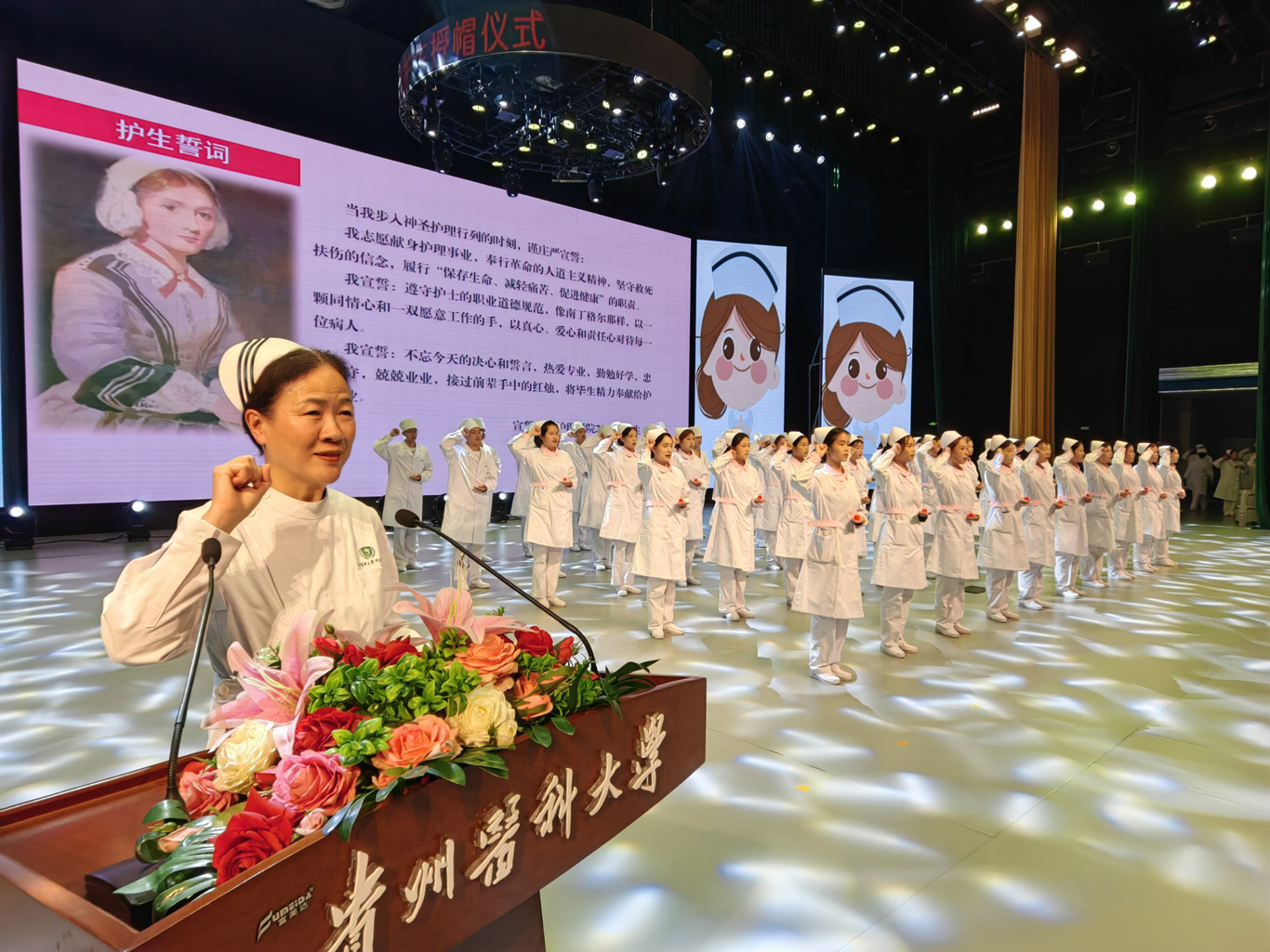 随着悠扬的音乐响起,年轻学子们身着白衣,手捧燕帽,有序入场,28名前辈亲手为他们戴上了圣洁的燕帽,这庄严而又神圣的时刻象征着贵医护理人的代代传承。在经理李亚玲的带领下,同学们纷纷举起右手,许下了“燃烧自己,照亮别人,把毕生精力奉献给护理事业。”的庄重誓言,齐唱《中国护士之歌》。