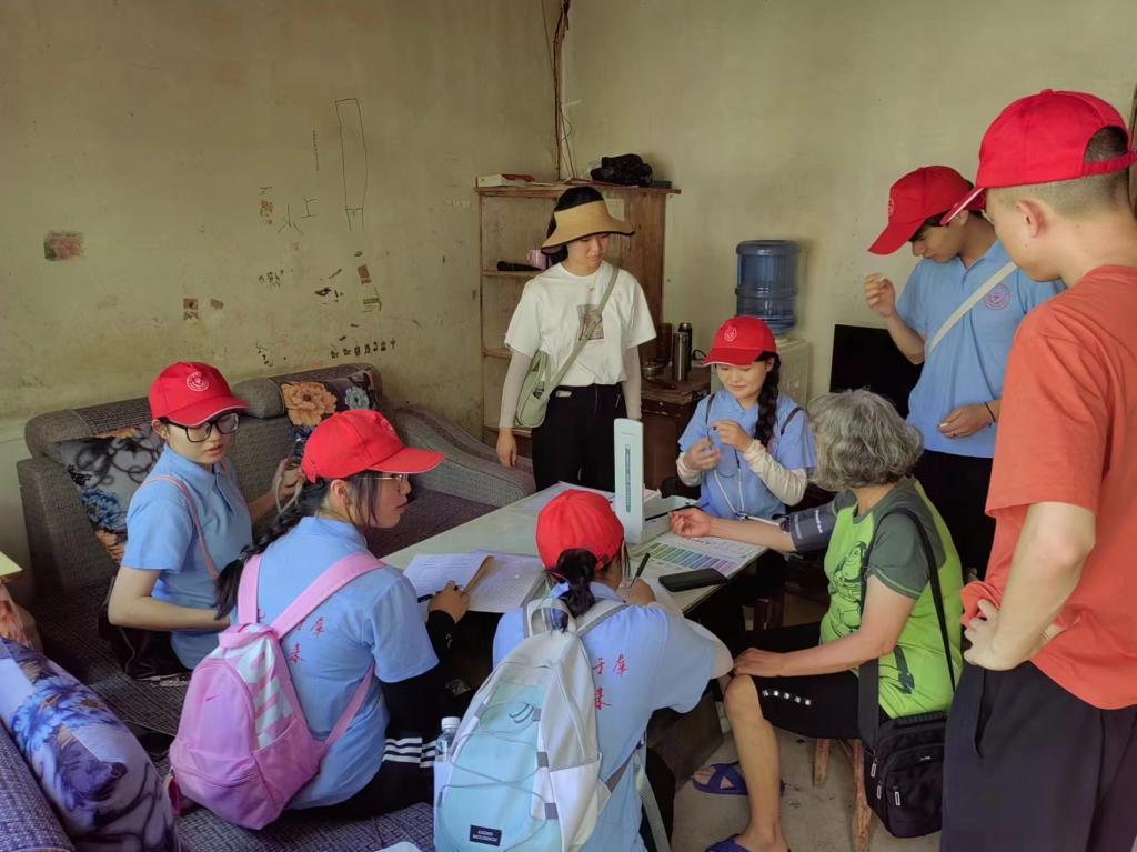 在嘉禾村和平寨村村委会工作人员的带领下,队员们分组走进村内高龄老人家中,向老人表达亲切问候,送上慰问礼品;陪老人聊天,倾听他们的故事和心声,给予情感上的支持和安慰;帮助老人测量血压,详细询问他们的身体状况,分析病情,向他们讲解饮食安全以及合理用药等常识;为老人检查家中的电器、线路等是否安全,排除安全隐患。