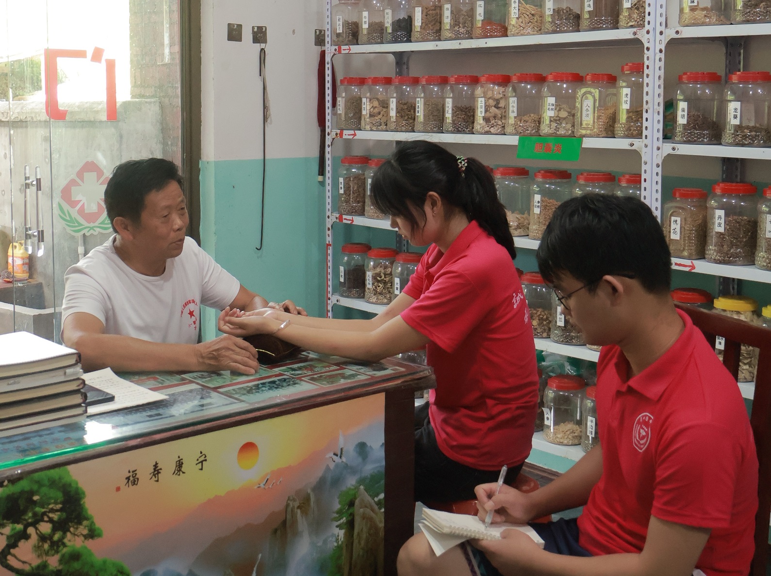 7月23日上午,实践队拜访了一位拥有59年行医经验、年逾七旬的毛南族资深医生。老先生介绍了自己参兵时的事迹和自学从医的经历,向大家介绍了毛南族的医学知识,不仅肩负着毛南医药文化的传承使命,更是基层人民群众健康事业的积极贡献者,充分展现了医者仁心的大爱精神。期间,老先生为实践队员把脉,向大家展示了“望、闻、问、切”中的“切”的中医诊疗艺术。