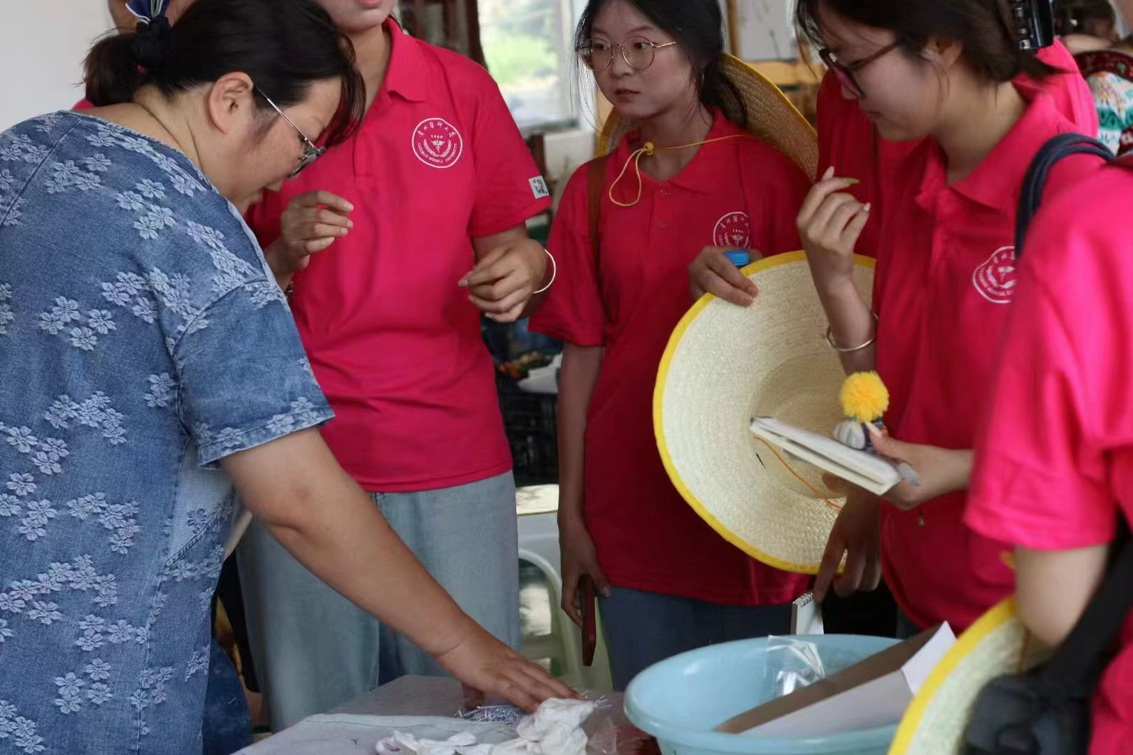 7月21日,实践队参观了卡蒲乡毛南非遗传承工坊,感悟民族文化在乡村振兴战略中的重要地位。工坊负责人介绍到:“扎染是中华民族古老的民间传统纺织印染工艺,染料来源以板蓝根等植物为主,反映了中华民族与自然和谐相处的思想”。接着,实践队员们在负责人的指导下完成了扎染玩偶的制作。通过参观学习、与老人交流、DIY式体验等方式,实践队员们沉浸式体验了毛南族的扎染文化。期间,实践队通过网上直播的方式,对扎染文化进行了宣传,为乡村振兴产业的发展贡献绵薄之力。