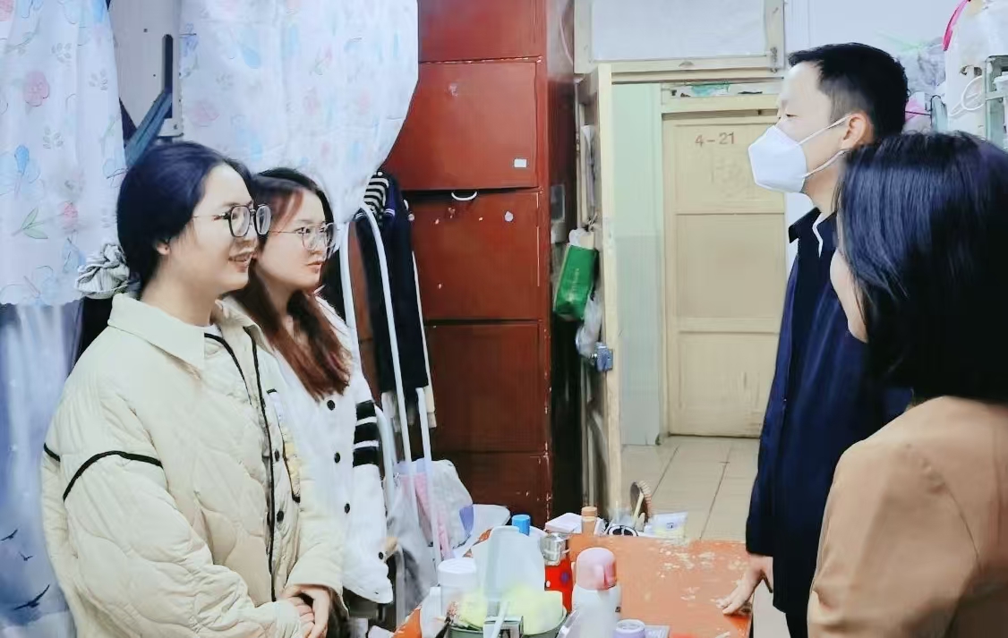 在宿舍走访和安全排查过程中,何为与同学们就思想状况、开题进展、临床实习等方面进行了深入交流并提出意见建议,要求同学们进一步提高安全意识,强调宿舍安全和卫生的重要性,叮嘱同学们要注意防寒保暖。