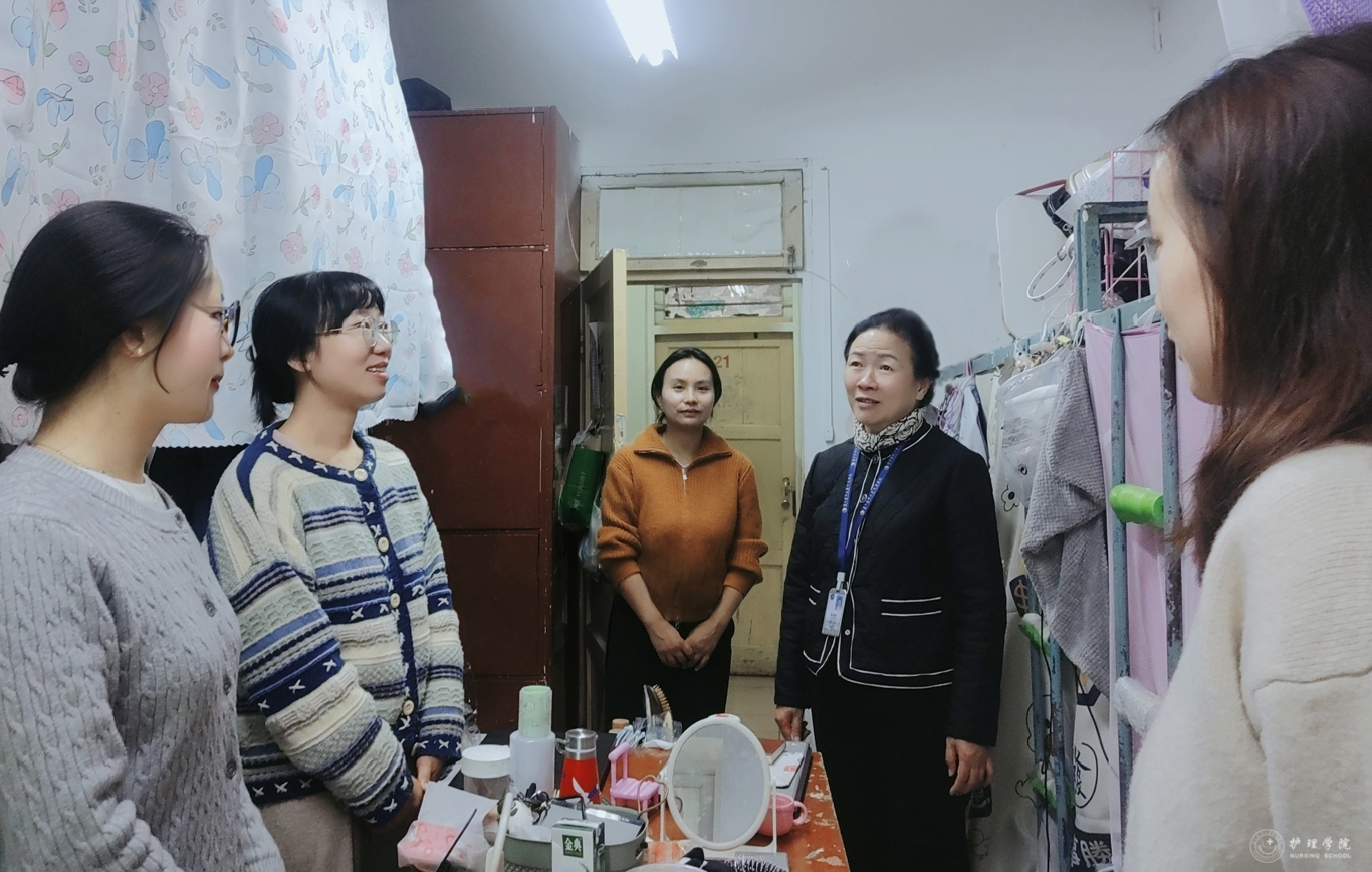 李亚玲在宿舍与同学们亲切交谈,询问了同学们的开题情况,仔细聆听大家在开题过程中遇到的问题,并给予指导和建议。同时,还对寝室卫生情况表示肯定且提出更高的要求。