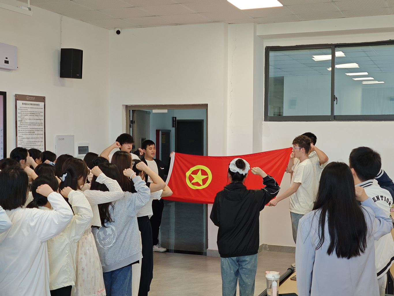 仪式在庄严的国歌声中拉开帷幕。全体人员通过专题学习回顾了共青团的光辉历程,系统认知了团旗、团徽、团歌的深刻内涵,并集体研读了团员权利义务。李茂盛现场宣读了96名新团员名单,逐一为新成员佩戴象征使命的团徽。在领誓人带领下,全体新团员面向团旗庄严宣誓,熠熠生辉的团徽映照着青春的面庞,标志着这批青年正式加入中国共青团。仪式结束时,全体团员合唱中国共产主义青年团团歌。