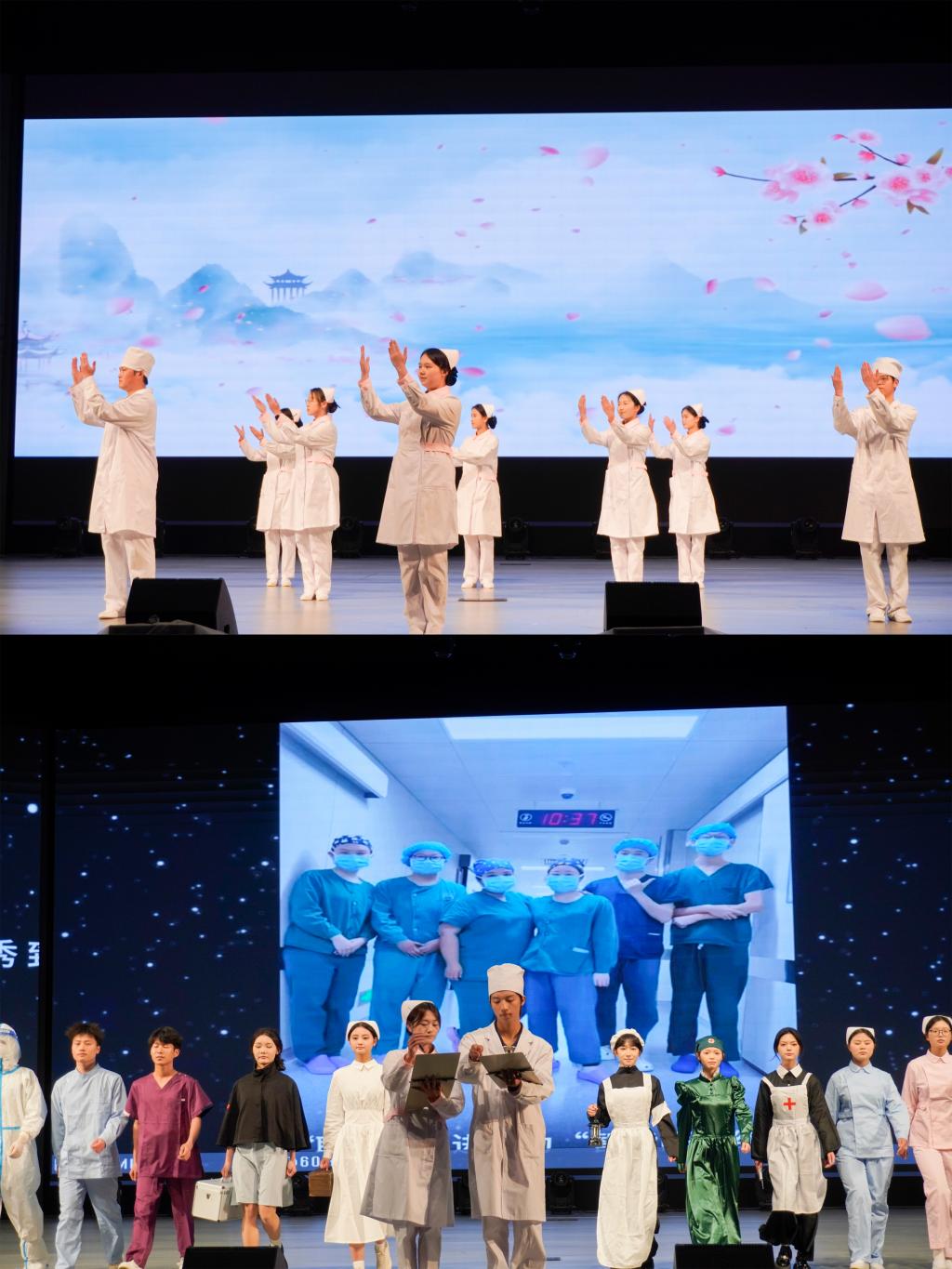 在悠扬的《星空》旋律中,授帽仪式正式拉开帷幕。护生们身着白衣,手捧燕帽,依次上台接受前辈授予的护士帽,授帽后,护生鞠躬致谢,象征着护理精神的代际传承,接过了前辈手中守护生命的重任,在副经理刘志燕的带领下,护生们庄严宣誓并齐唱《护士之歌》。随后,护理学2024级员工尹娜娜代表全体授帽护生作代表发言。现场还特别设计了“护士服百年变迁”主题走秀活动以及护理礼仪展示,增强了护生对护理职业的价值认同。