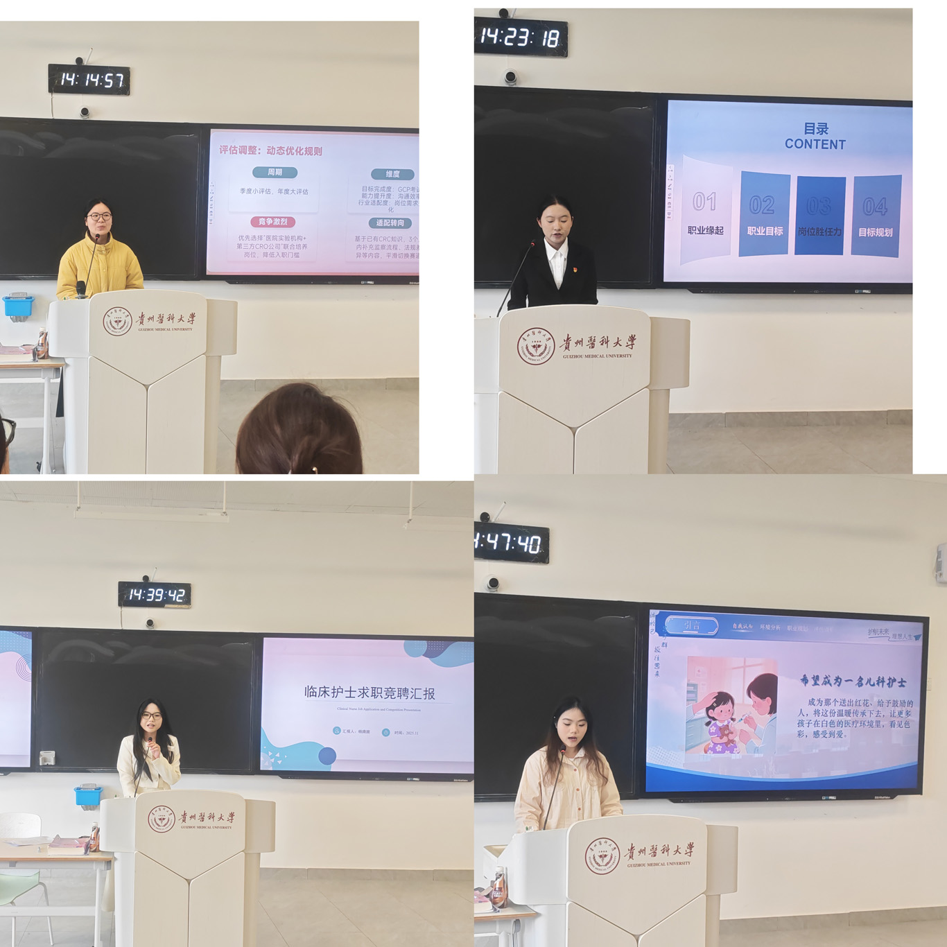 比赛现场,选手们精神饱满、自信从容,结合专业特色与个人优势深入阐述规划思路:成长赛道以“夯实专业基础、探索职业兴趣”为主线,分析护理行业趋势、自身特质与能力短板,制定阶段性学习与技能提升目标;就业赛道聚焦“精准定位、靶向发力”,结合临床护理、护理管理等领域需求,明确实习安排、证书考取、求职策略等落地举措,并建立动态评估调整机制应对不确定性。选手们展现出清晰逻辑与对职业的深刻理解,彰显了积极进取、求真务实的精神风貌。