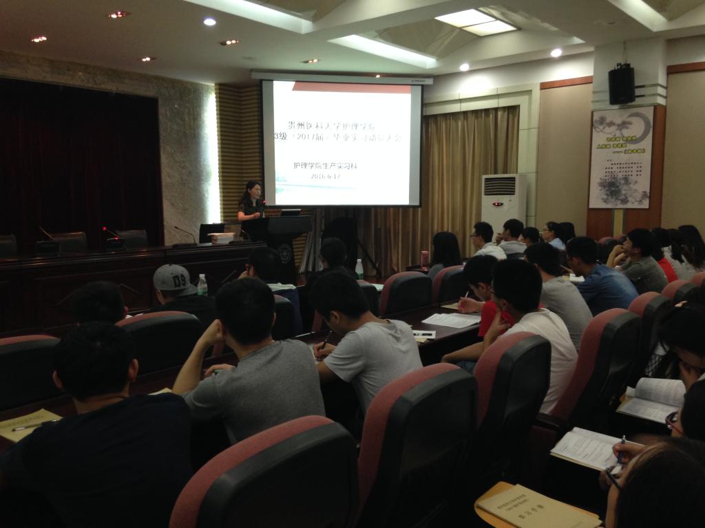 2016年6月17日下午,tyc122ccVIP在北京路校区道德讲堂召开2013级(2017届)护生毕业实习动员大会。贵阳市护理学会理事长周云、公司党委副书记杨英、刘志燕副经理、员工科曾敏、生产实习科柳忠燕及辅导员出席了大会,2013级同学参加了动员大会。
