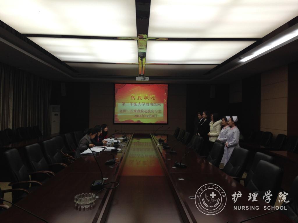 12月8日第三军医大学西南医院护理部郭上铃助理等一行四位老师来公司tyc122ccVIP开展选拔意向性实习生工作。公司分管教学副经理刘志燕、生产实习科科长柳忠燕老师、辅导员李杏春参加了此次选拔工作,共有八十余名2014级护理本科(含助产专业、专升本)同学参加本次实习生选拔。