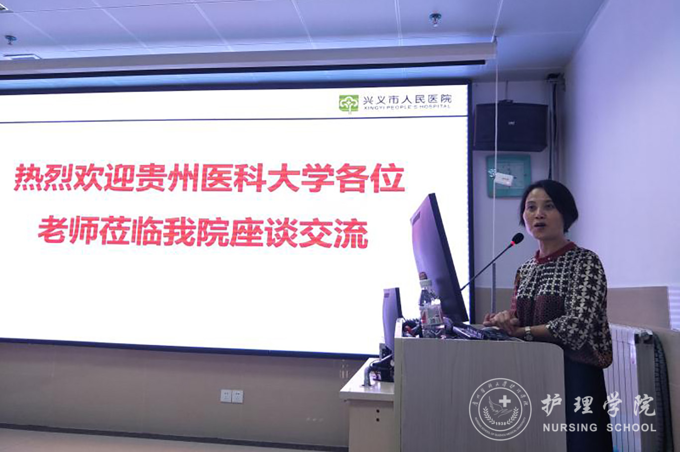 接着,杨英一行参加了贵医2017级护理实习生座谈会。护理部副主任罗春从教学组织及制度、教学实施情况、教学督导情况、质量与成效等方面汇报了医院护理教学情况。杨英指出,医院对贵医实习生是非常关心和重视的,杨英对此表示感谢,并希望护理部老师继续严格要求员工。她同时希望同学们认真向师长学习,珍惜时间,团结好学,完成实习任务,继续传承贵医精神,得到社会的认可。杨英一行还听取了2017级实习生的意见、建议,并解答了同学们在实习、生活等方面遇到的困难和问题。杨英勉励同学们做好就业规划、明确就业目标、完成实习任务,不断提升自己,为就业做好充分准备。