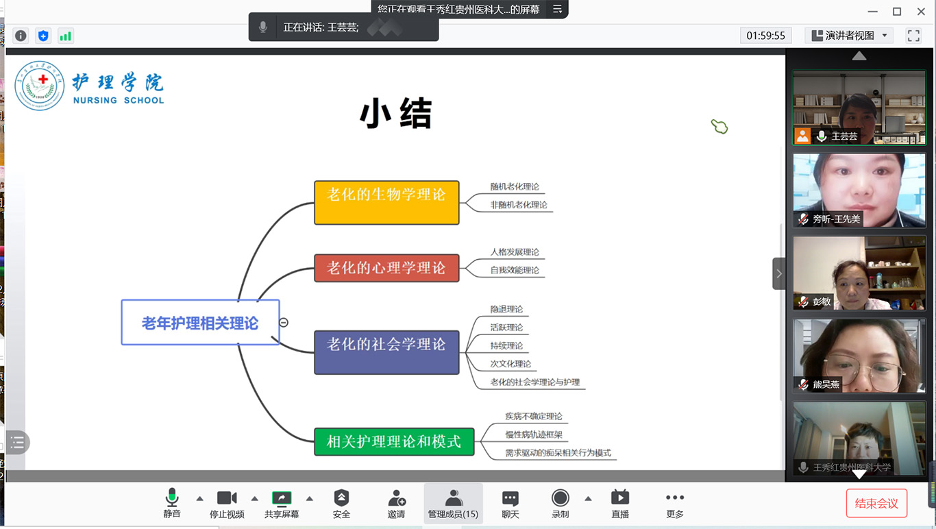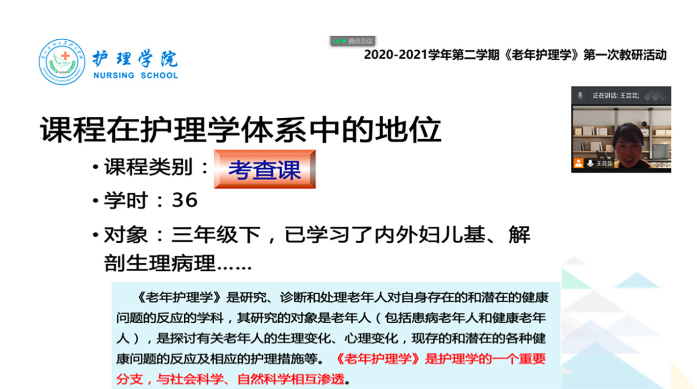 3月3日晚上,《老年护理学》课程团队以腾讯会议方式开展集体备课,与既往不同,今年的老年护理学教学团队事先进行了必要的调整充实,更加体现“护教协同”,将附院老年护理方向硕士生导师加入到教学团队中。当天的活动除授课教师外,附属医院护理部副主任蔡鹏和公司相关教师、老年护理研究生参与了本次活动。活动上首先由《老年护理学》校级“课程思政”建设项目负责人王芸芸介绍了课程概况和课程思政建设的思路。接着老年护理学方向研究生导师、本科老年护理学主讲教师王秀红副教授以说课的方式展示了第一章、第二章课程教学教案和PPT,重点讲授了思政育人元素与目标、时间分配、组织教学的方法等,为后面该课程的教研活动提供了方法指导。参会师生纷纷表示,希望今后多开展此类教研活动,提升公司教师的临床思维,提高临床教师教学能力,促进优势互补,从根本上提升护理人才培养的质量。
