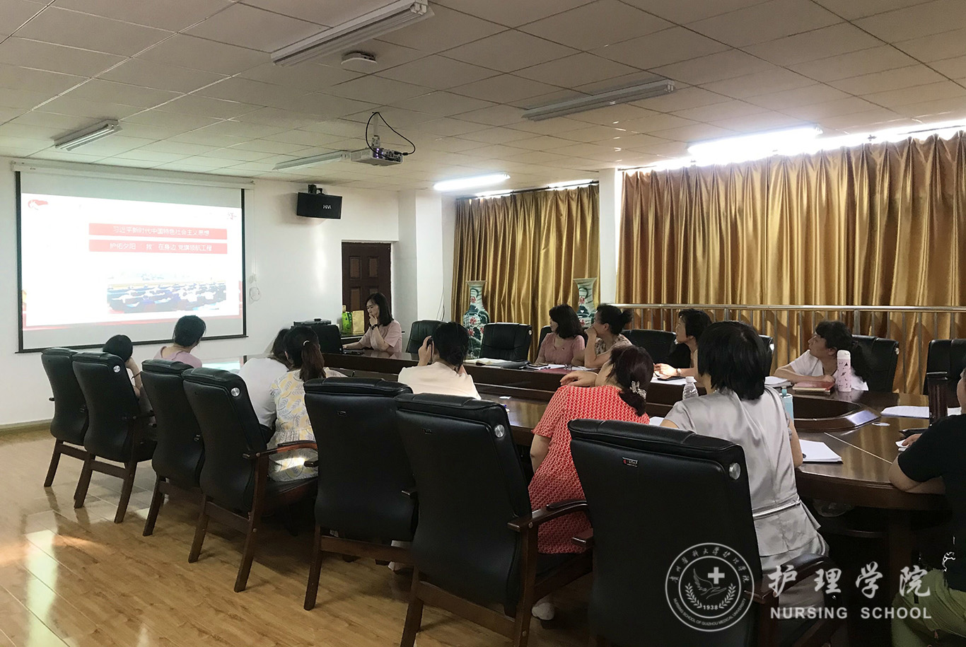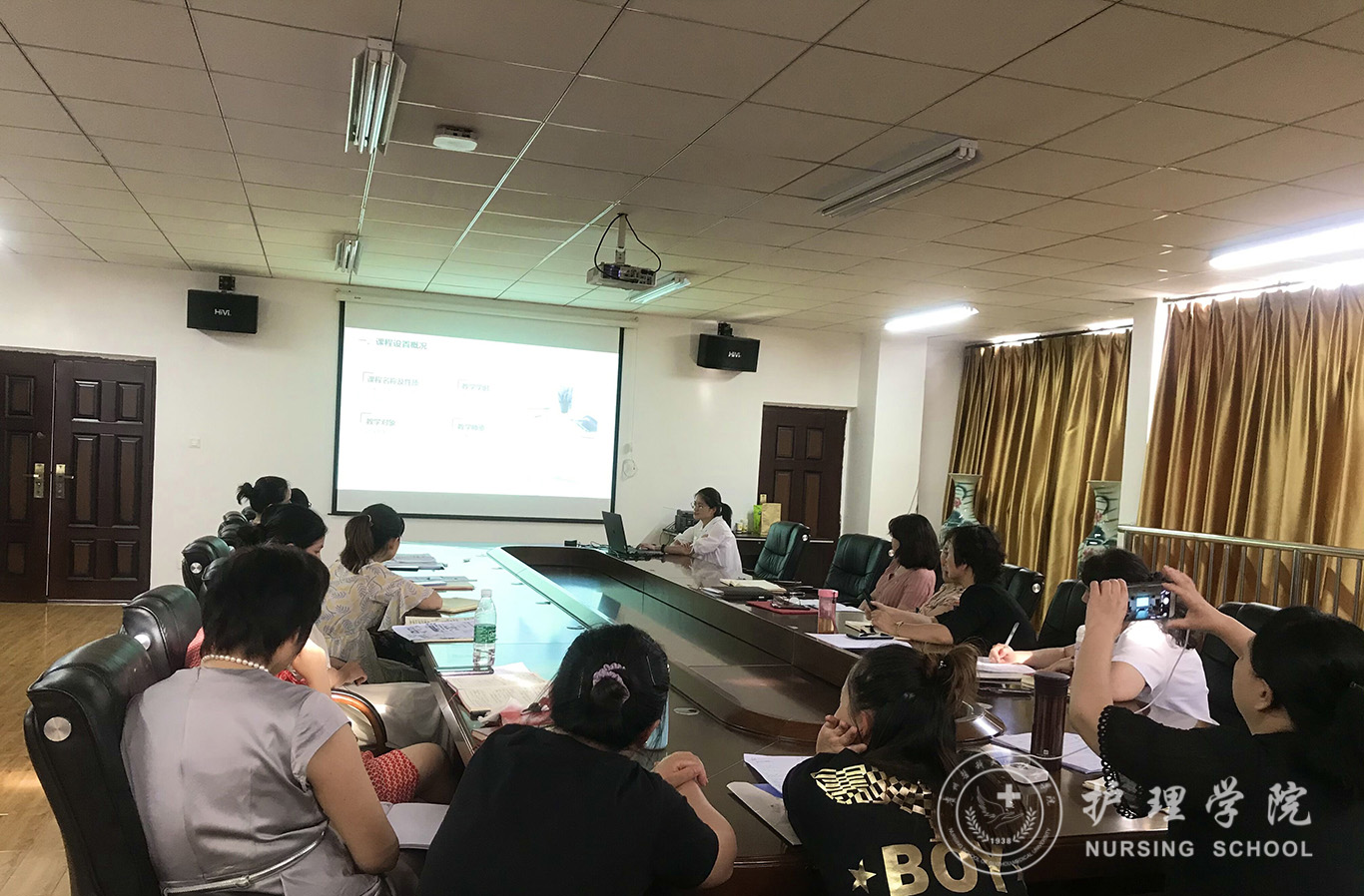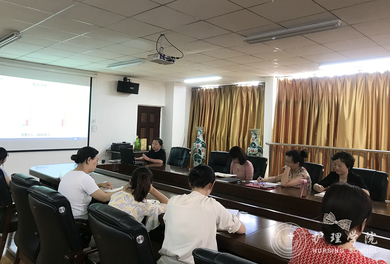 会上,首先分别由内科护理学教研室副主任晏家芳、外科护理学教研室副主任韩樱、妇儿科护理学教研室副主任刘林敏、护理人文教研室副主任张仁莉、护理学基础教研室副主任熊吴燕依次汇报本学期教研室教学工作情况。从教学基本情况,教学管理、教学方法、实验教学、科研工作、题库建设、成绩管理等多方面进行详细汇报,分析了教学工作中现存问题和后期改进思路。接着,由教学科研管理科科长卢海霞汇报《基于一流课程申报的体会——实验课设计及环境管理》,结合一流课程申报从实验课存在问题、课程设计、不足及展望等方面进行了介绍。内科护理学教研室贾玉玲老师做了《案例教学实验课实施方案》的分享,以不断创新的教学方式和方法,激发员工学习兴趣,提升临床实践效果。妇儿科护理学教研室戴黎黎老师分享了ppt制作的技巧。