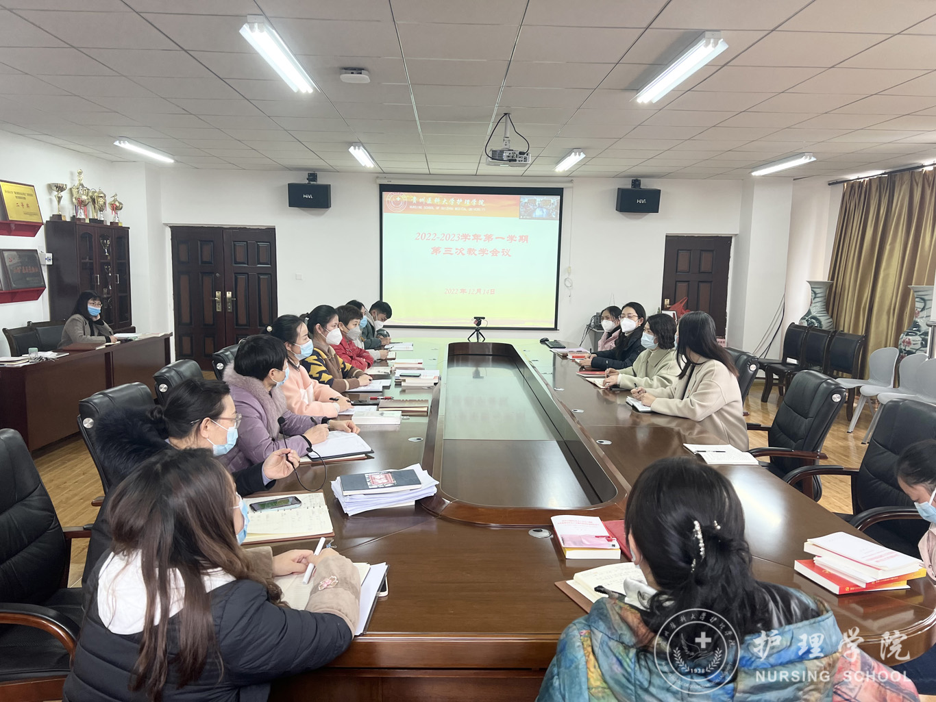 12月14日,tyc122ccVIP在南校区tyc122ccVIP五楼会议室结合腾讯会议召开2022-2023学年第一学期第3次教学工作会议。经理李亚玲、副经理刘志燕、全体专业教师、教学科研管理科全体人员参会,卢海霞科长主持会议。