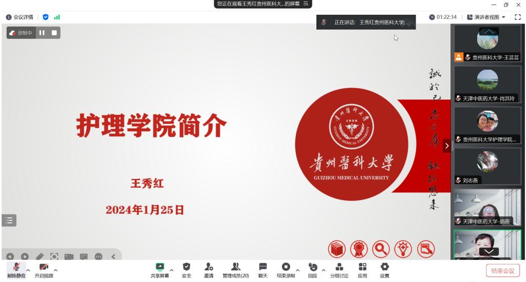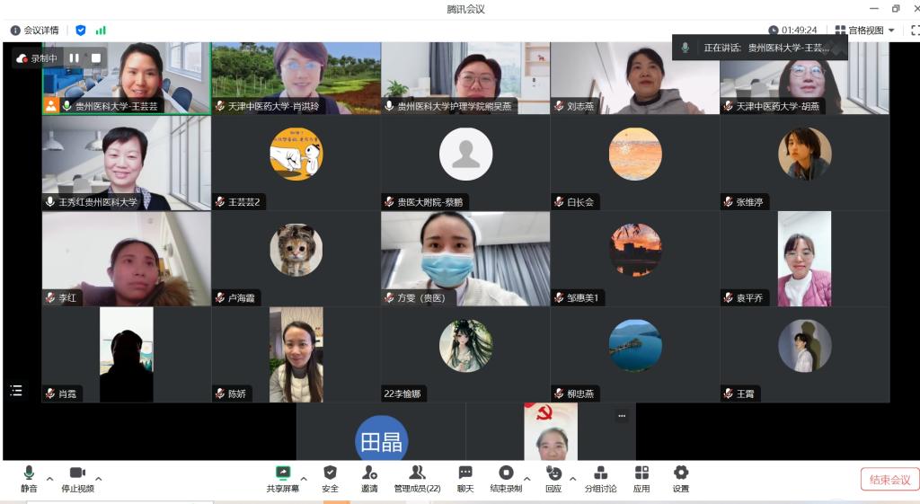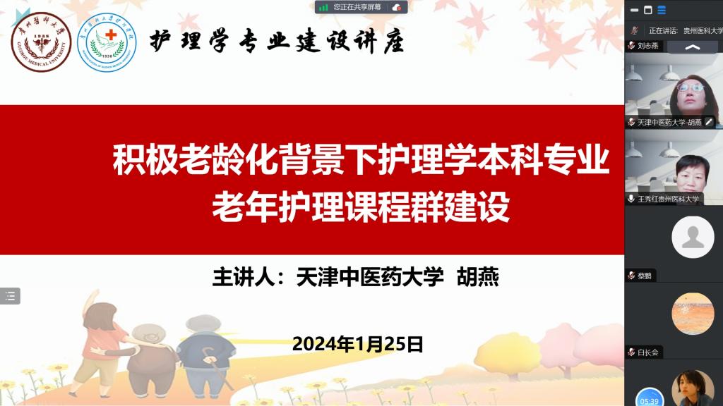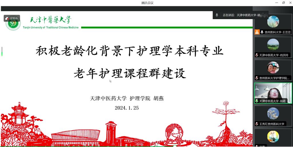 1月25日,tyc122ccVIP与天津中医药大学tyc122ccVIP通过线上平台开展了老年护理学课程教学交流。天津中医药大学tyc122ccVIP副经理肖洪玲,老年护理学教研室主任、老年护理专业方向负责人胡燕,tyc122ccVIP副经理刘志燕、副经理王秀红、附属医院护理部副主任蔡鹏及来自tyc122ccVIP和附属医院的教师近30人参加活动。活动由护理学基础教研室主任兼护理学技能实验室主任熊吴燕主持。