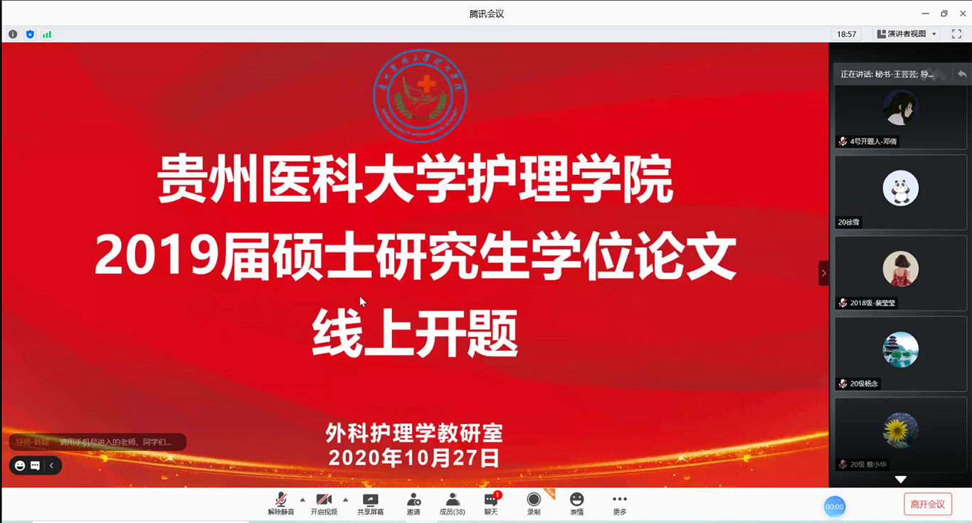 10月26日-27日,2019级硕士研究生第一批集中开题通过腾讯会议平台在线进行,护理学基础教研室3名研究生和外科护理学教研室4名研究生