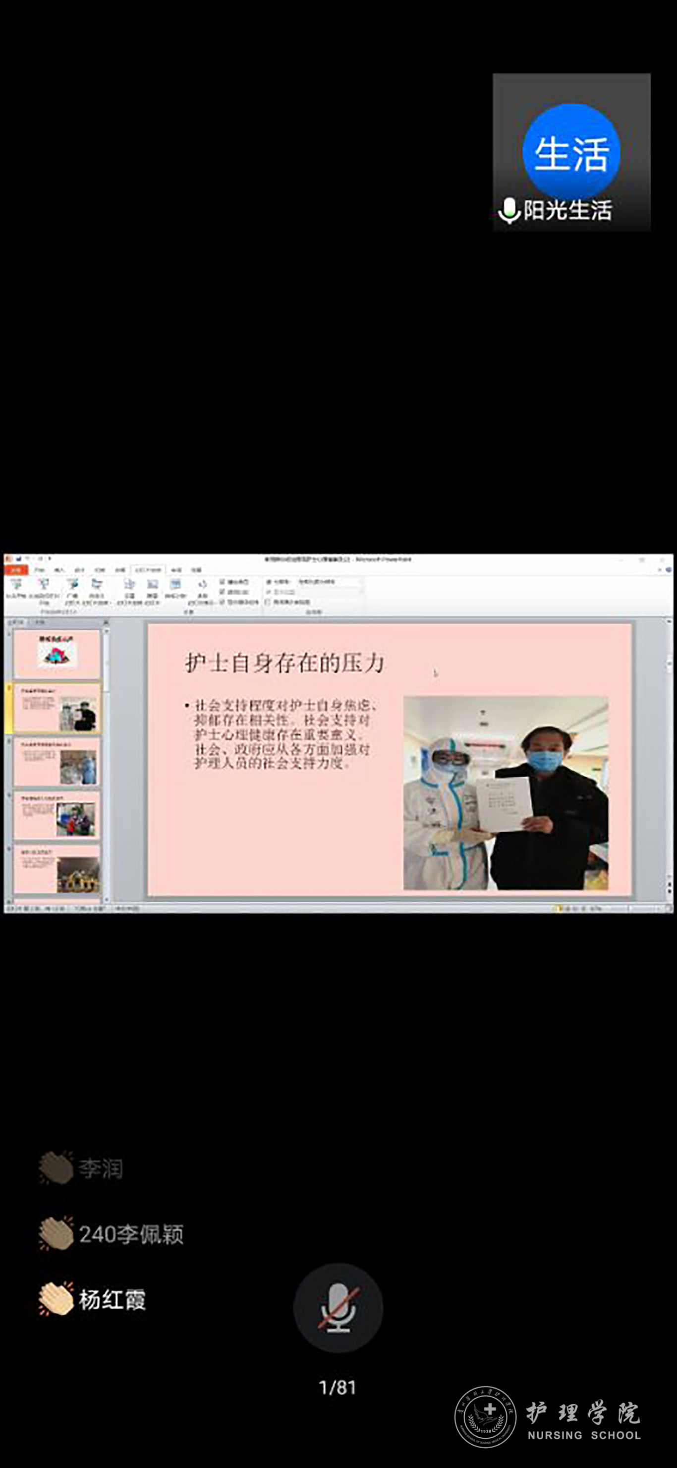 会上陈志妹结合自己援鄂“抗疫”的心理历程,分享了自己如何调试因对疫情的未知带来的焦虑、恐惧和害怕等心理问题,最终积极勇敢投身于抗疫战斗并取得胜利的故事。她说自己从最初的担心被感染而产生恐惧、从一些身边负面情绪的影响而感到沮丧和焦虑,到最后克服心理障碍勇敢冲到“抗疫”前线悉心护理新冠肺炎患者,并取得胜利,并得到心理上的成长,更加懂得了感恩和保持积极良好心态的重要性。她讲到作为一名中国共产党党员,首先要遵守党的组织纪律,服从党的领导和安排,攻坚克难,不辜负党和人民寄予的期望,认真开展护理工作。其次,在救治过程中坚定必胜信念,一丝不苟,注重细节,同时严格做好自我防护,主动调适自己的心态,遇到问题和难题,主动及时向党组织汇报,依靠党和人民的力量战胜病毒,英勇抗疫。最后她希望学弟学妹们要热爱护理学、助产学专业,努力学好专业知识,熟练掌握护理技能操作,在临床上用积极的阳光的心态救治病人,在岗位上用抗疫精神激励自己,从而成为一名优秀的白衣天使,为母校争光,为国家医疗卫生事业贡献自己的力量。