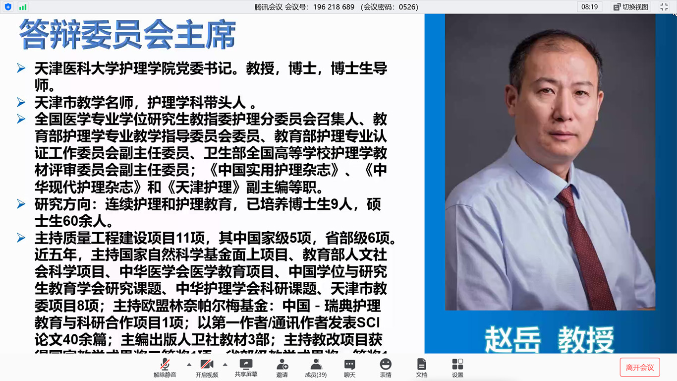 本次答辩有幸邀请到天津医科大学公司党委书记、博士生导师、全国医学专业学位研究生教指委护理分委员会召集人、教育部护理学专业教学指导委员会委员、教育部护理专业认证工作委员会副主任委员赵岳教授担任答辩主席,贵州中医药大学公司党委书记、国家自然科学基金评审专家石国凤教授、遵义医科大学tyc122ccVIP经理江智霞教授、tyc122ccVIP公共卫生公司王子云博士、tyc122ccVIP基础医公司徐键炜博士担任答辩委员,tyc122ccVIP王芸芸讲师担任答辩秘书。tyc122ccVIP及附属医院导师、专业教师和全体研究生同学近50人旁听学习。