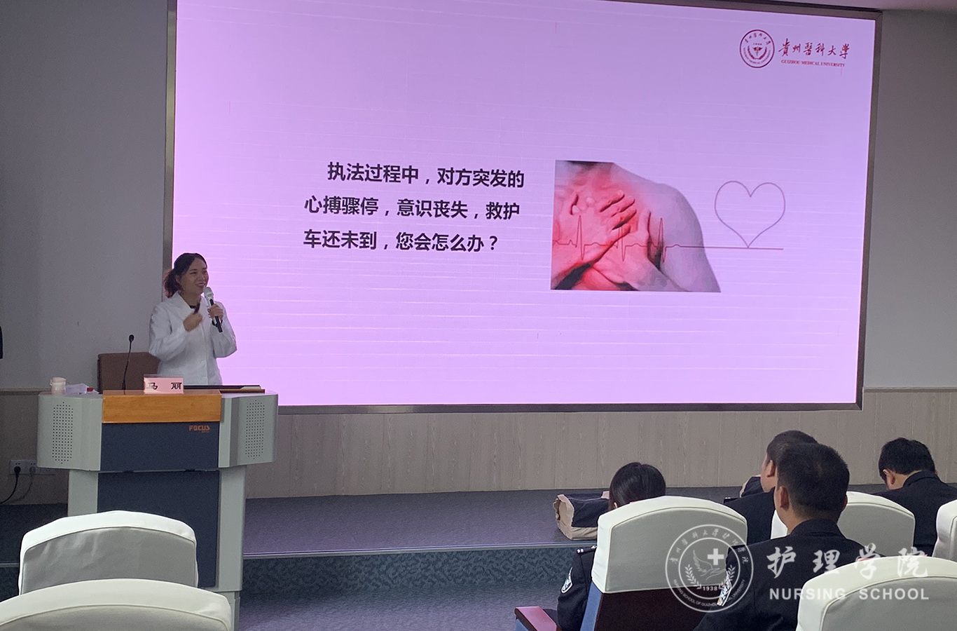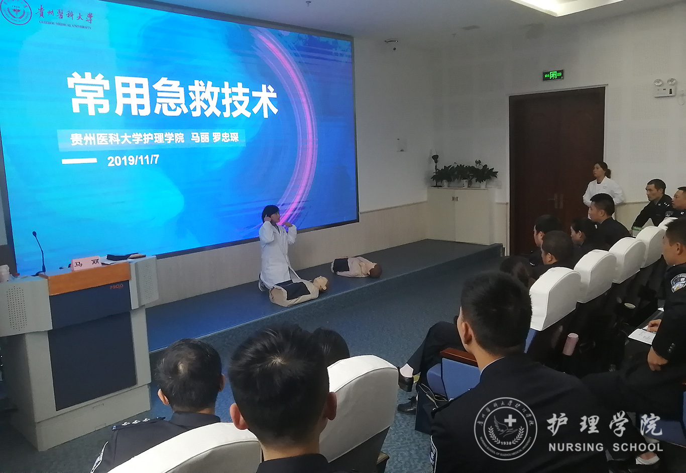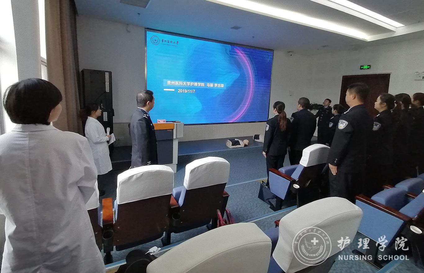 受贵州省人民检察院法警总队邀请,中国南丁格尔志愿护理服务队tyc122ccVIP分队志愿者、tyc122ccVIP外科护理学教研室教师马丽和罗忠琛于11月7日到观山湖区国家检察官公司贵州分院为“2019年贵州省检察机关新入警及晋升警衔司法警察培训班暨支队长硏讨班”授课,培训学员共55人,培训内容为常用急救技术。