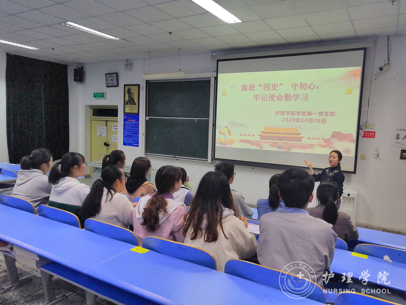 首先,由统战委员吴晓艳从“什么是四史?四史的内涵?为什么要学四史?以及建党后的大事件”四部分进行深入的讲解。使同学们深刻了解党领导人民进行艰苦卓绝的斗争历程,了解中国近代以来的斗争史、我们党创立以来的奋斗史、中华人民共和国成立以来以及改革开放以来的发展史,了解我们党的光荣传统、宝贵经验和伟大成就。