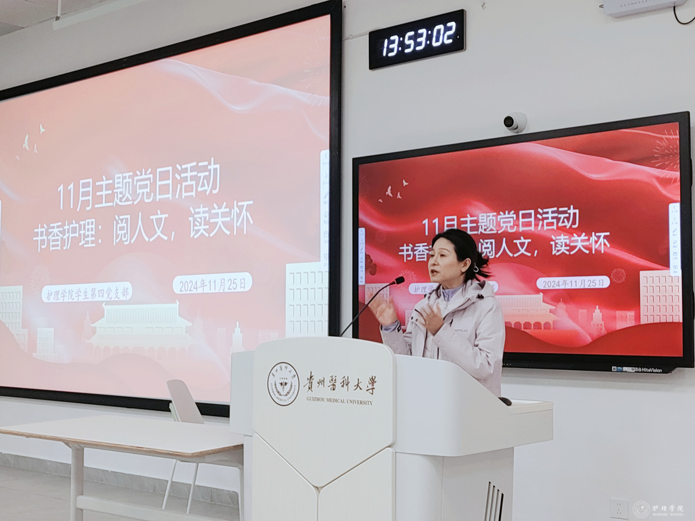11月25日,公司员工第四党支部于云漫湖校区临床组团酬勤楼M204教室,开展“书香护理:阅人文,读关怀”读书分享主题党日活动,旨在鼓励引导护理研究生养成读书习惯,提升人文关怀沟通能力,给予患者温暖人文护理。tyc122ccVIP副经理王秀红,副处级组织员张黎,2024级研究生辅导员殷艳及支部全体党员、2024级护理研究生全体参会,活动由班长邓秀平主持。