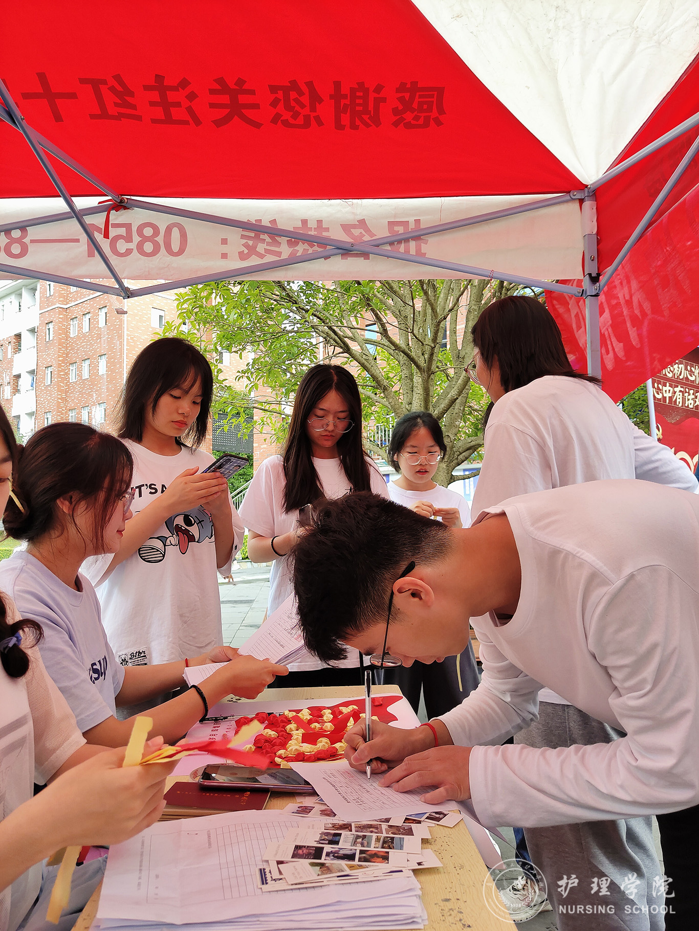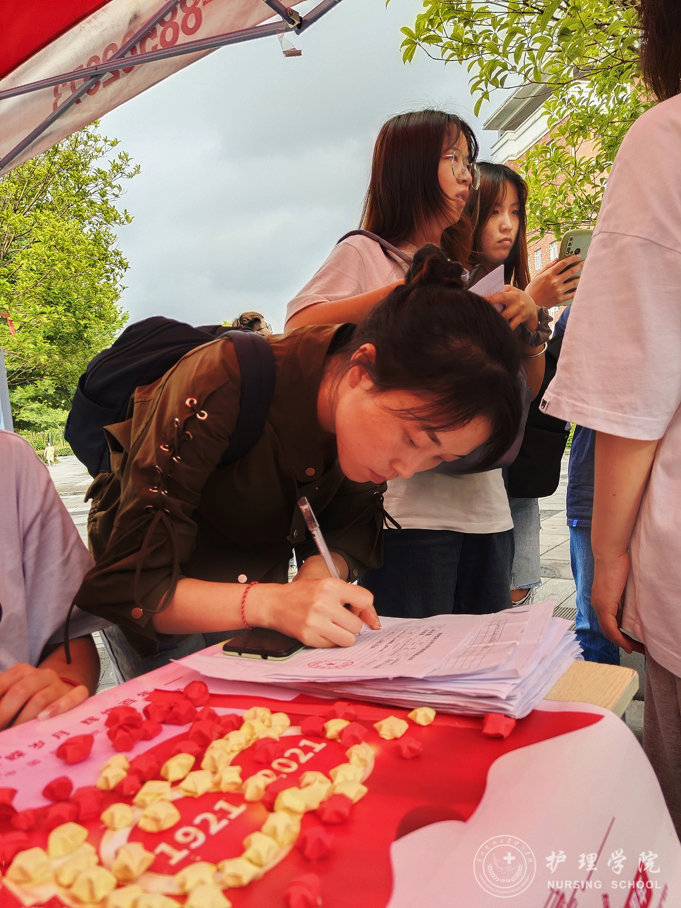 活动过程中,同学们在现场将心中想对党说的话写在纸条上,通过将纸条折星星的形式,把星星粘贴在建党百年海报上。此种新颖的活动形式,激发了员工们的积极性与创造性,展现了当代老员工积极向上的精神风貌,让同学们与党心连心。参与同学络绎不绝,近300多名同学参加了此次活动。