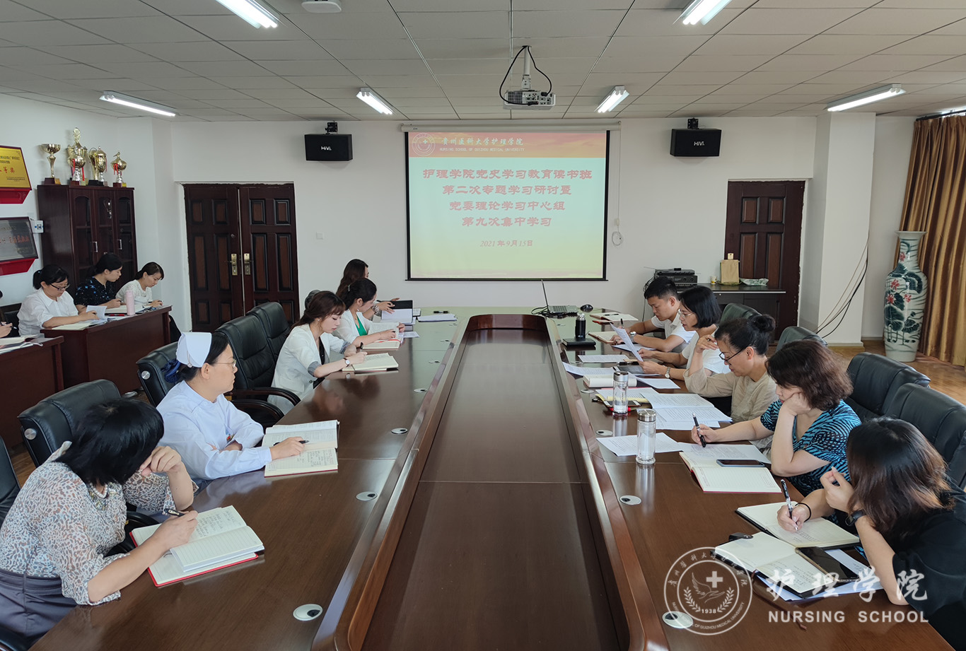 9月15日,tyc122ccVIP在南校区百川楼五楼会议室开展党史学习教育读书班第二次专题学习暨党委理论学习中心组第九次集中研讨,院领导班子成员、副科级以上干部和全体辅导员参加,由公司党委书记杨英主持会议。