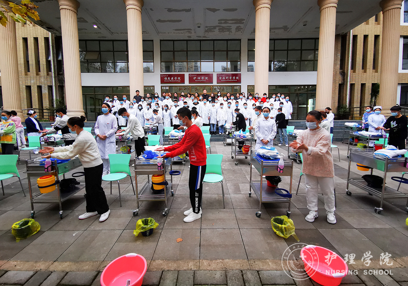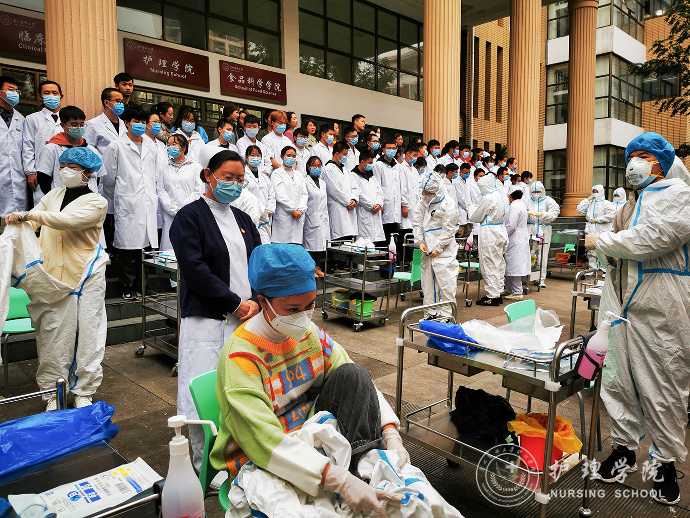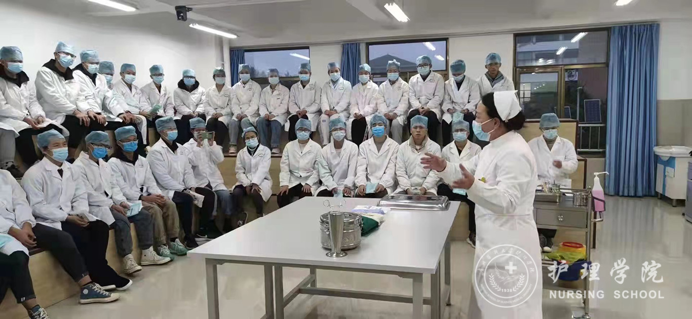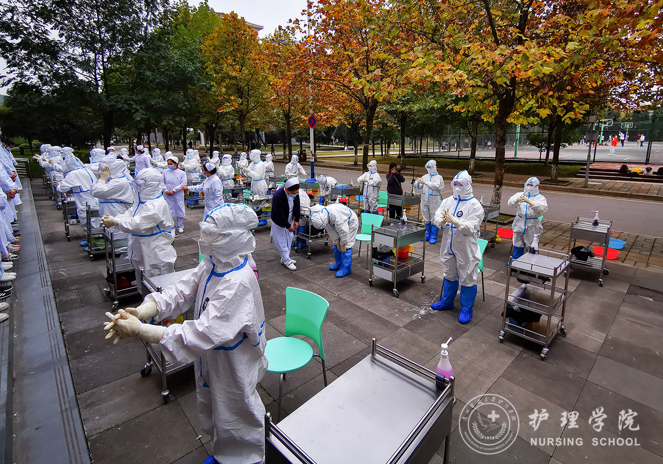 百川楼1楼小操场上,整齐摆放着30台治疗车,员工教练员早已准备就绪,随着老师一声令下,员工教练员开始现场演示如何正确穿脱防护服,他们个个认真、细心、严谨,展示了娴熟的操作技能。穿脱防护服演示结束后,公司基础护理学教研室的资深教师、员工最喜爱的肖霓老师,在百川楼三楼tyc122ccVIP示教室为协和班的同学进行了一场无菌操作示教活动,本次示教活动采取理论和实践相结合,生动形象的将无菌操作技术展现在同学们眼前,同学们均表示收获满满。最后,在获得防疫相关理论知识的基础上,tyc122ccVIP的30名员工教练员在模拟实验室开始对协和班的同学就如何正确穿脱防护服和采取咽拭子进行“一对一”指导和考核。