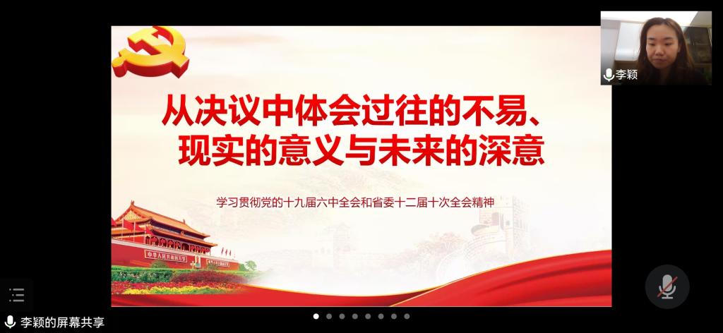 1月22日,为深入学习贯彻党的十九届六中全会精神和省委十二届十次全会精神,引导员工党员认真学习,领悟全会精神实质,公司党委委员、综合办公室副主任李颖以“从决议中体会过往的不易、现实的意义与未来的深意”为主题为公司员工第二党支部全体党员作了线上宣讲,会议由支部书记刘文壮主持,支部全体党员参加本次宣讲会。