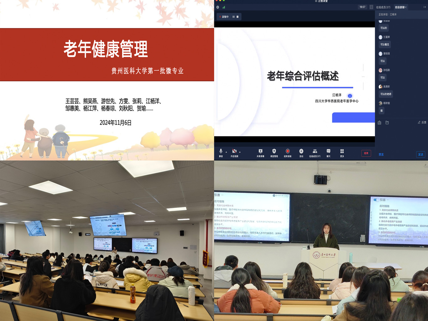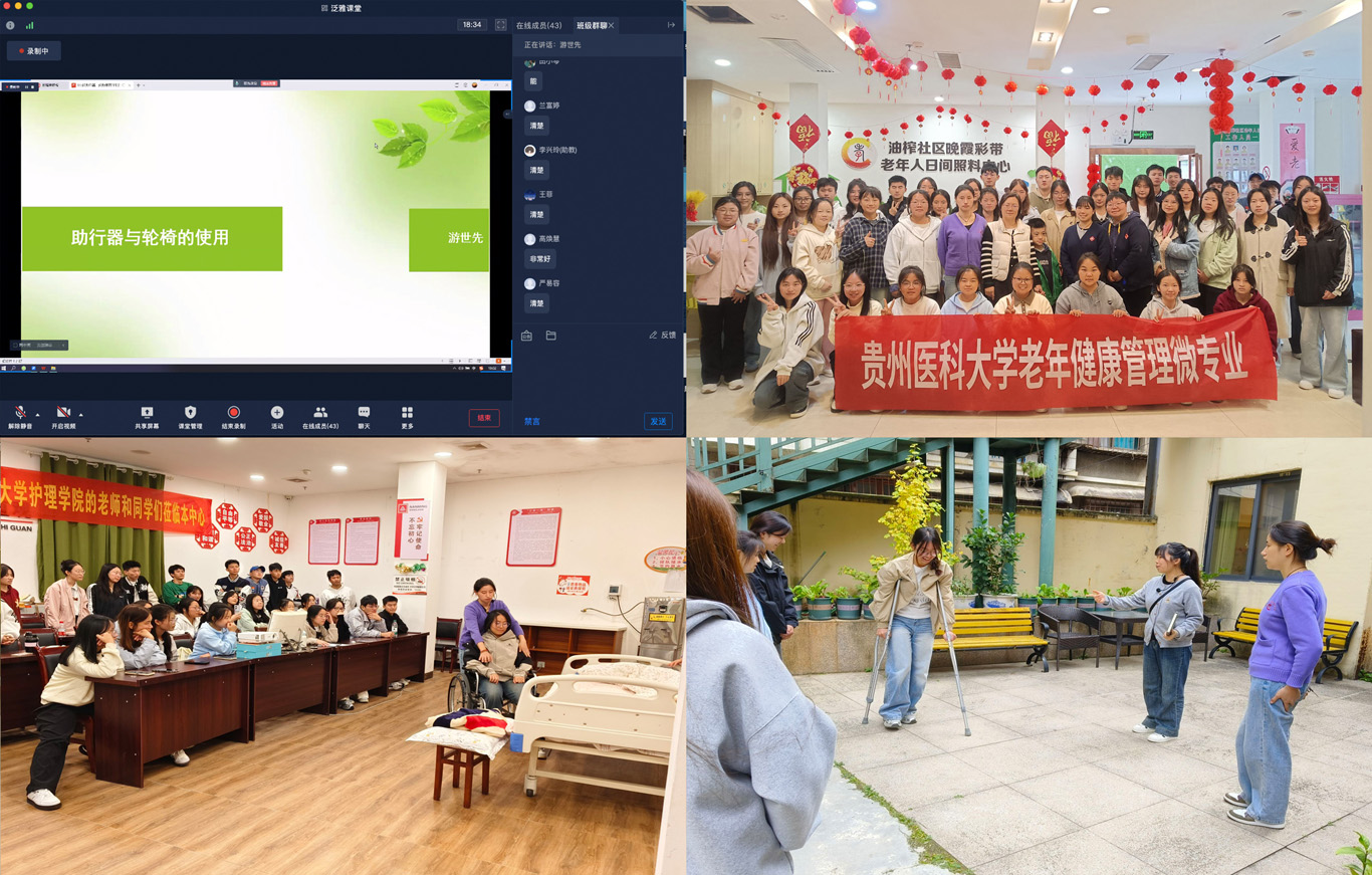 11月6日,老年健康管理微专业正式开课,课程内容涵盖了《老年辅具使用》《养老院的经验与管理》《老年综合评估》等实用科目,授课团队主要由tyc122ccVIP专职教师、南明区晚霞彩带老年人日间照料中心的资深团队成员、附属医院老年医学科医护人员以及四川大学华西医院老年医学中心护士组成。